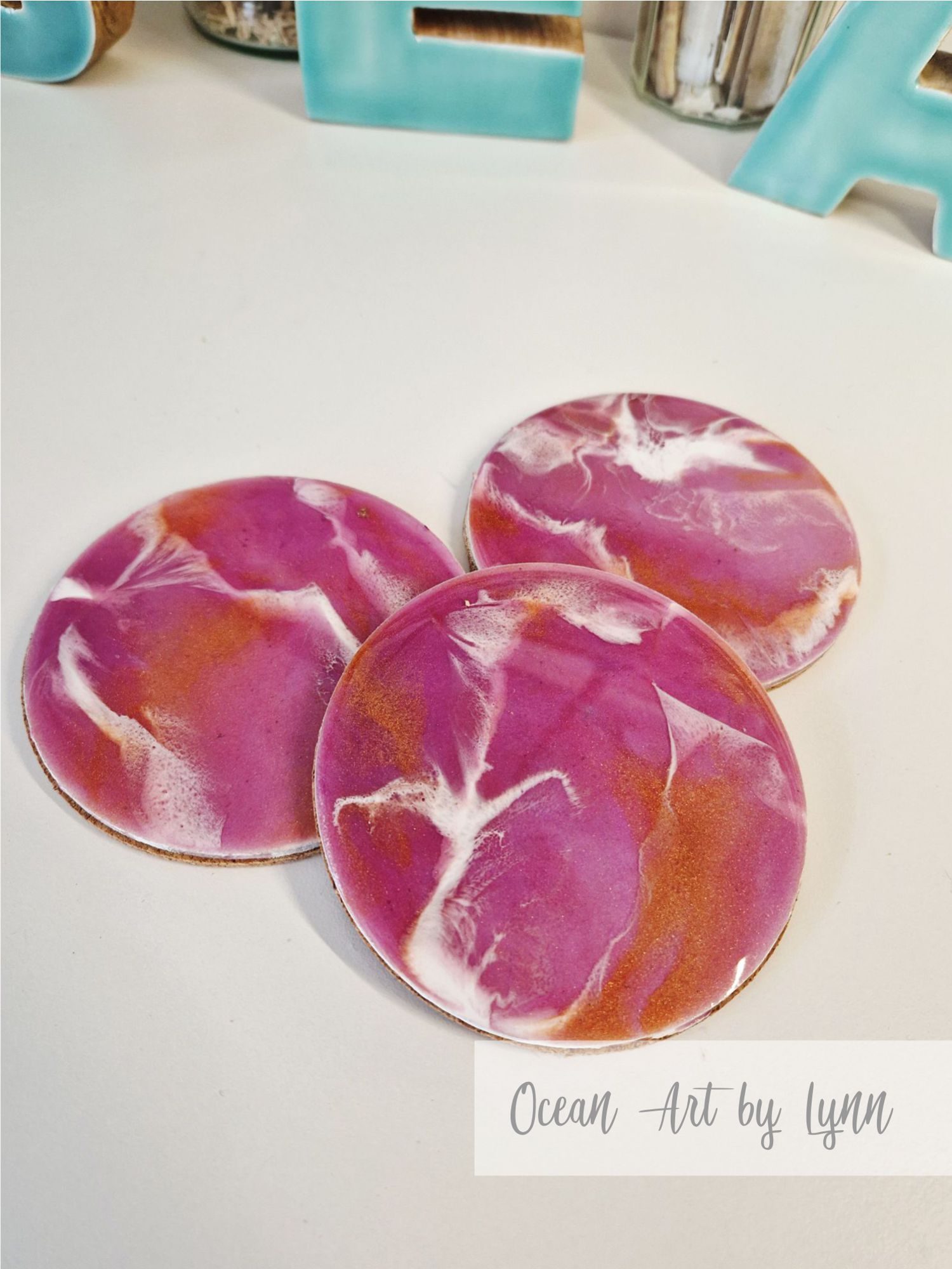 Set of three handmade resin ocean coasters, cork underlayer. Unique and beautiful pink colors.