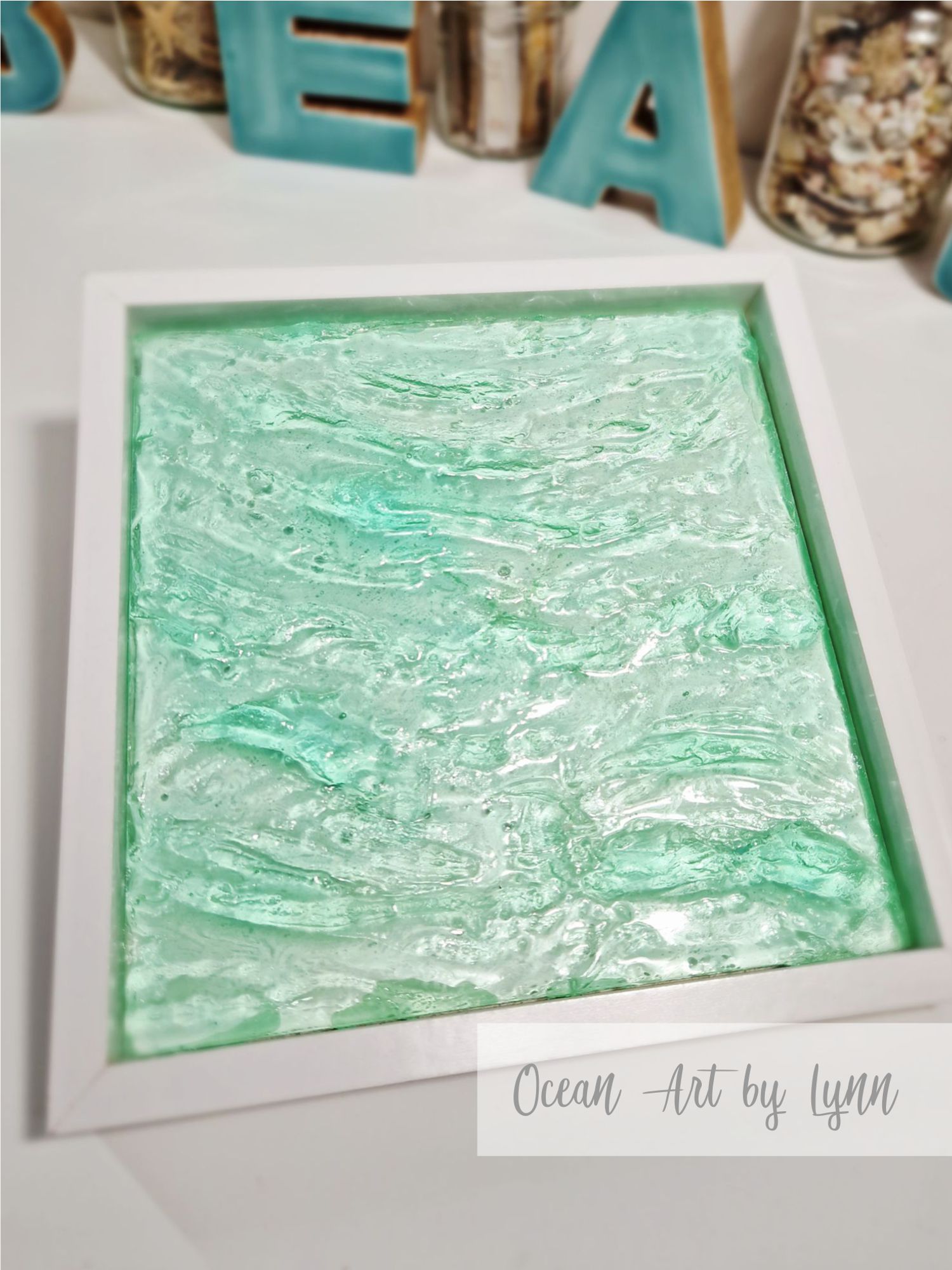 still views of waves and ripples in the most beautiful shades of blue. The piece of art is placed in a white frame.