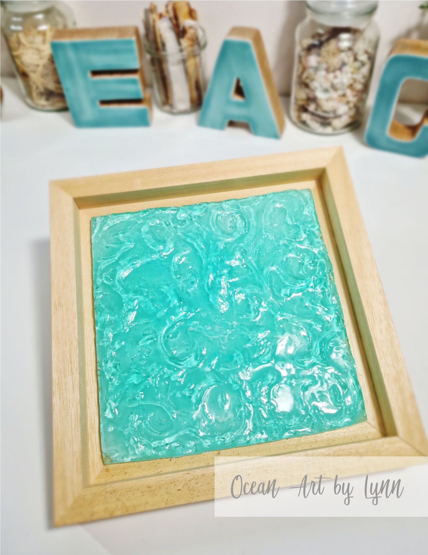 still views of waves and ripples in the most beautiful shades of blue. The piece of art is placed in a frame Ayous naturel.