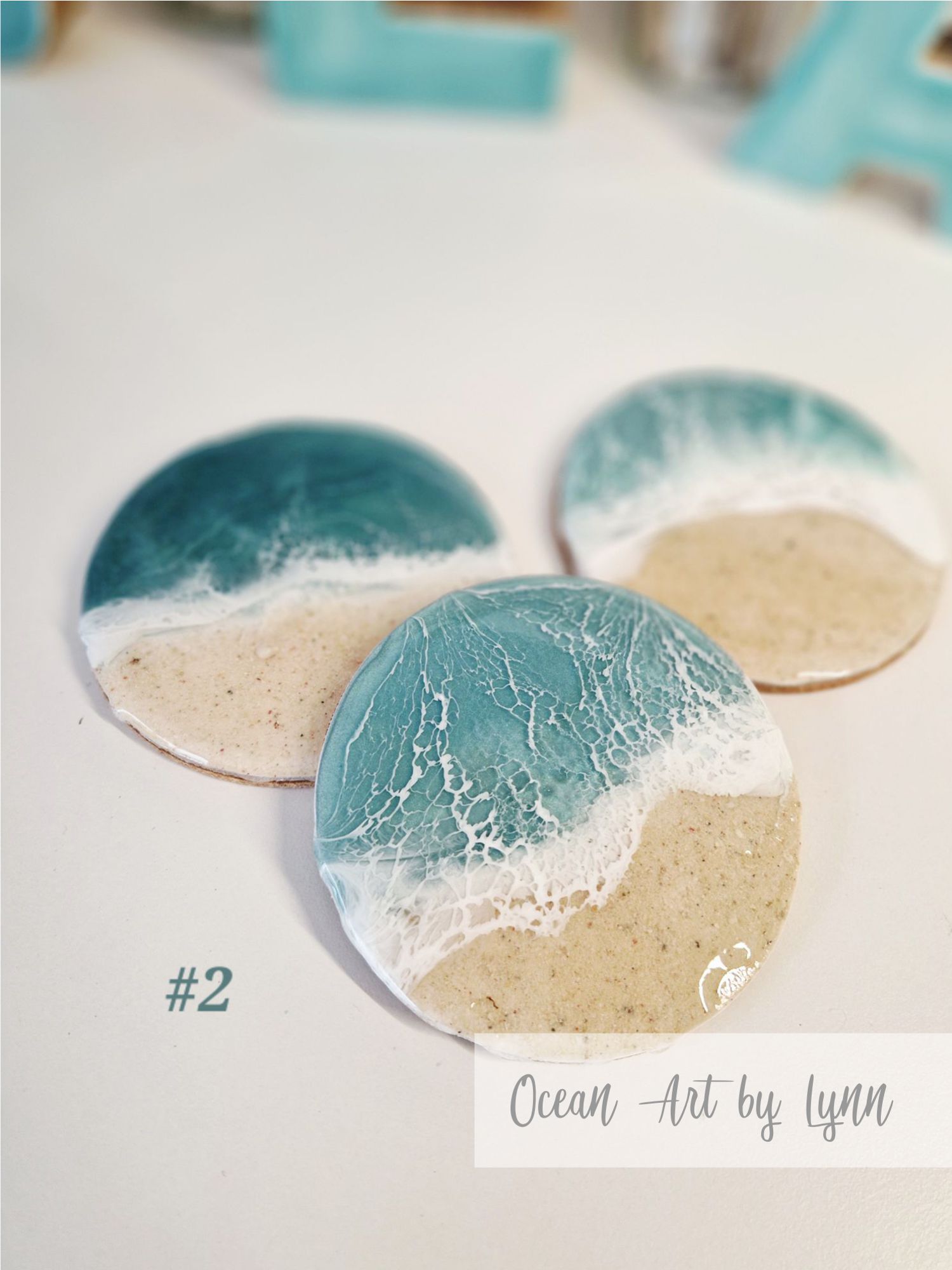 Set of three handmade resin ocean coasters, cork underlayer. Unique and beautiful turquoise colors.