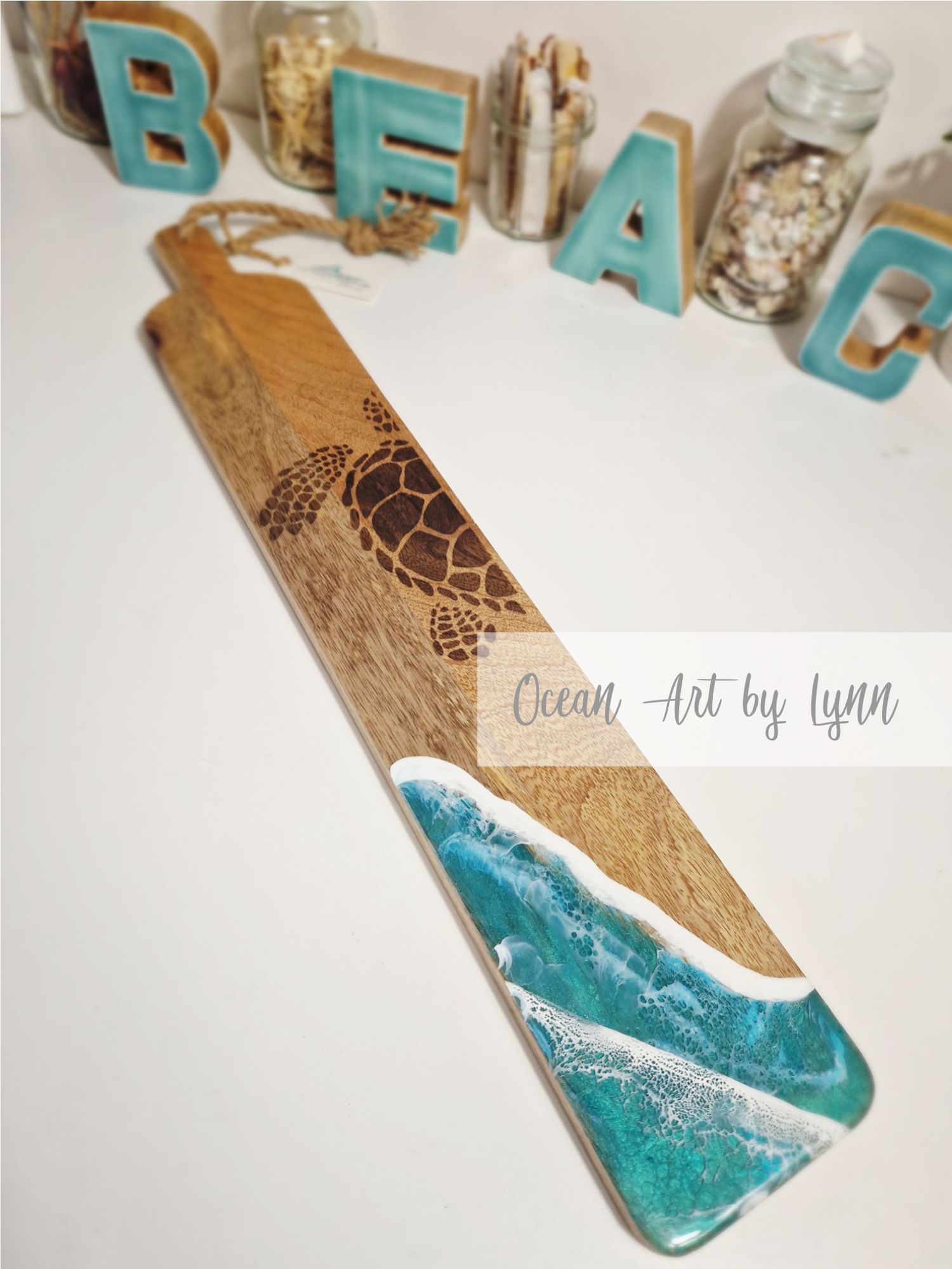 XLbaguette board, so cute to serve your bread on this engraved board with turtle coming out of those turquoise resin waves.